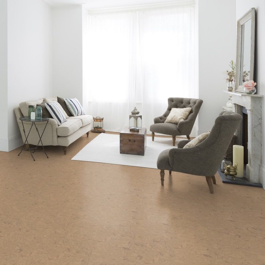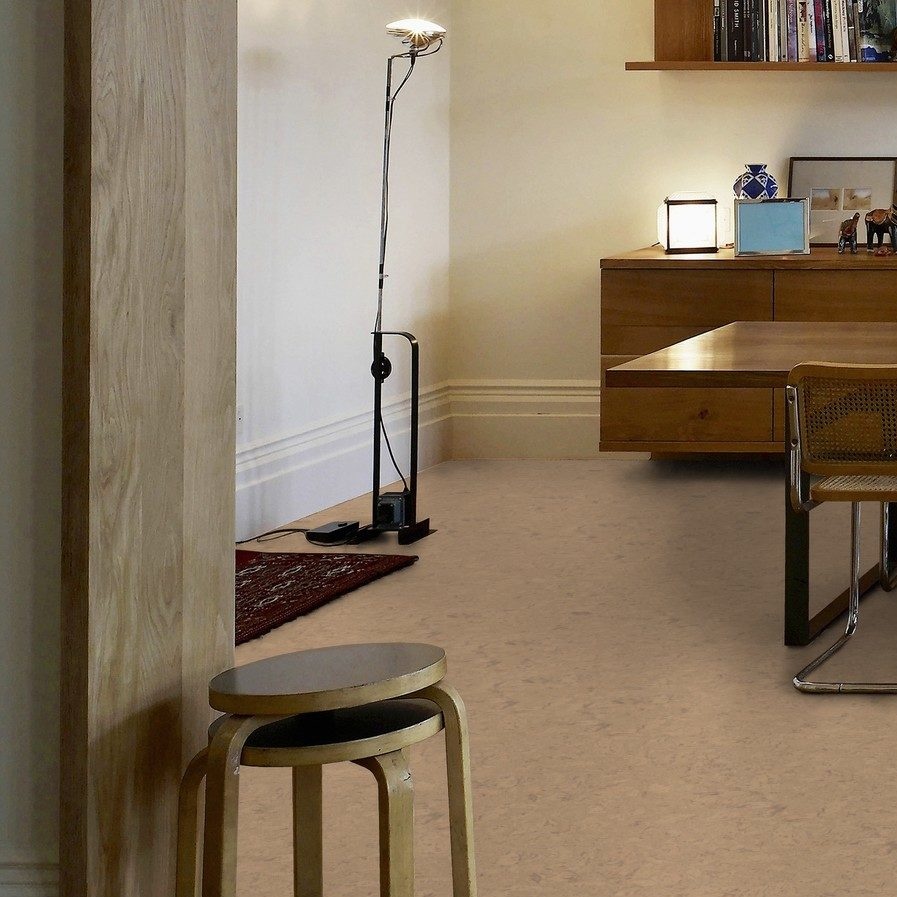 De vloer bestaat uit massief kurk en voelt hierdoor warm en stil aan.